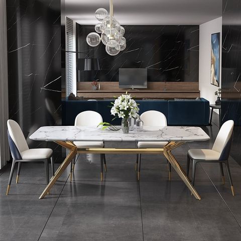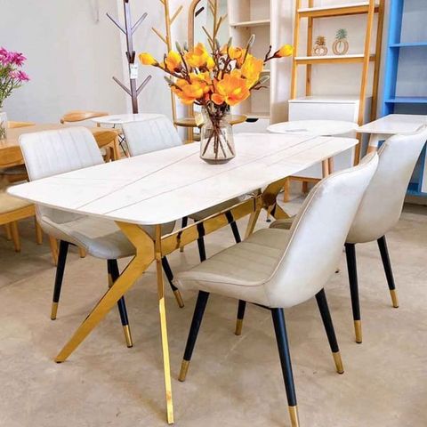 Chất liệu: Mặt bàn đá Ceramic, chân inox mạ vàng