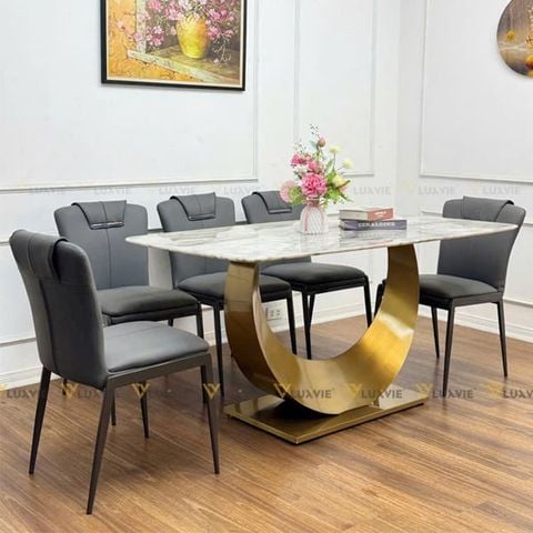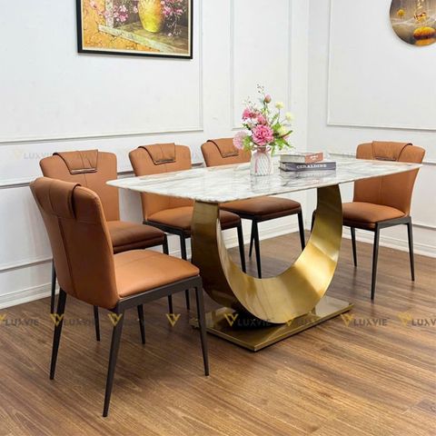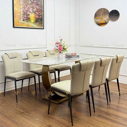 Chất liệu: Mặt bàn đá Ceramic, chân inox 201 mạ vàng