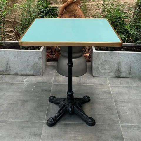 Chất liệu: chân gang đúc, mặt bàn nhôm sơn tĩnh điện màu xanh, viền bàn nhôm sơn mạ vàng.