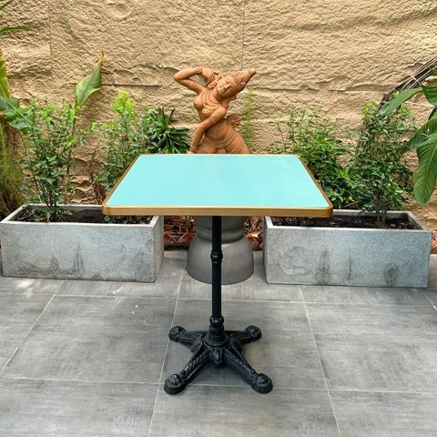 Bàn cafe ngoài trời BCV70X kết hợp giữa chân gang đúc và mặt bàn nhôm sơn tĩnh điện màu xanh, tạo nên vẻ đẹp vừa hiện đại vừa cổ điển. Viền bàn được sơn mạ vàng, mang lại sự lấp lánh và sang trọng, đồng thời giúp bàn nổi bật hơn trong không gian ngoài trời.