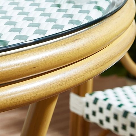 Mặt bàn được làm từ nhựa giả mây, một loại chất liệu phổ biến trong thiết kế ngoại thất nhờ vào tính thẩm mỹ cao và khả năng chống chịu tốt. Nhựa giả mây mang đến vẻ ngoài tự nhiên, gần gũi với thiên nhiên, đồng thời dễ dàng làm sạch và bảo trì. Chất liệu này cũng có khả năng chống nước, chống tia UV, đảm bảo rằng mặt bàn luôn giữ được màu sắc và hình dáng ban đầu dù phải tiếp xúc với nắng mưa hàng ngày.