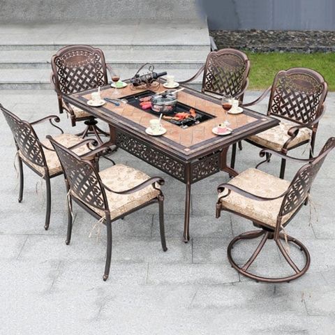 Chất liệu: Nhôm đúc, sơn tĩnh điện, mặt đá gốm có bếp than/ bếp điện