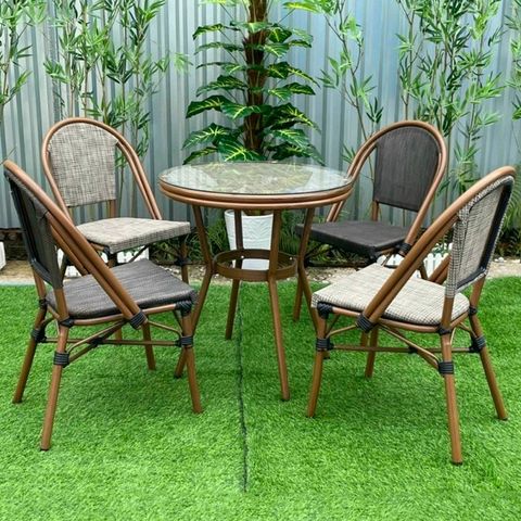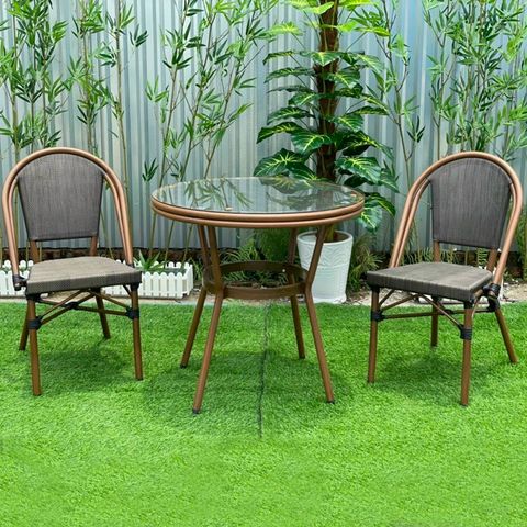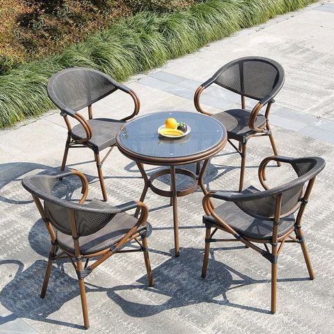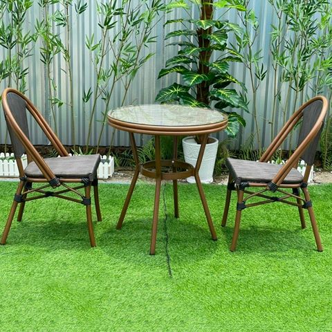 Chất liệu: Khung nhôm đúc, mặt bàn nhựa giả mây, mặt kính