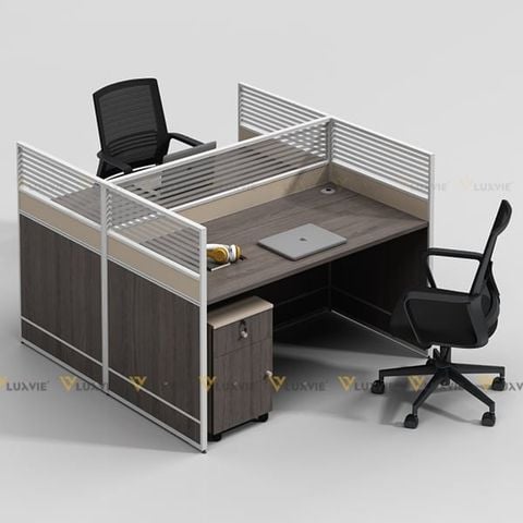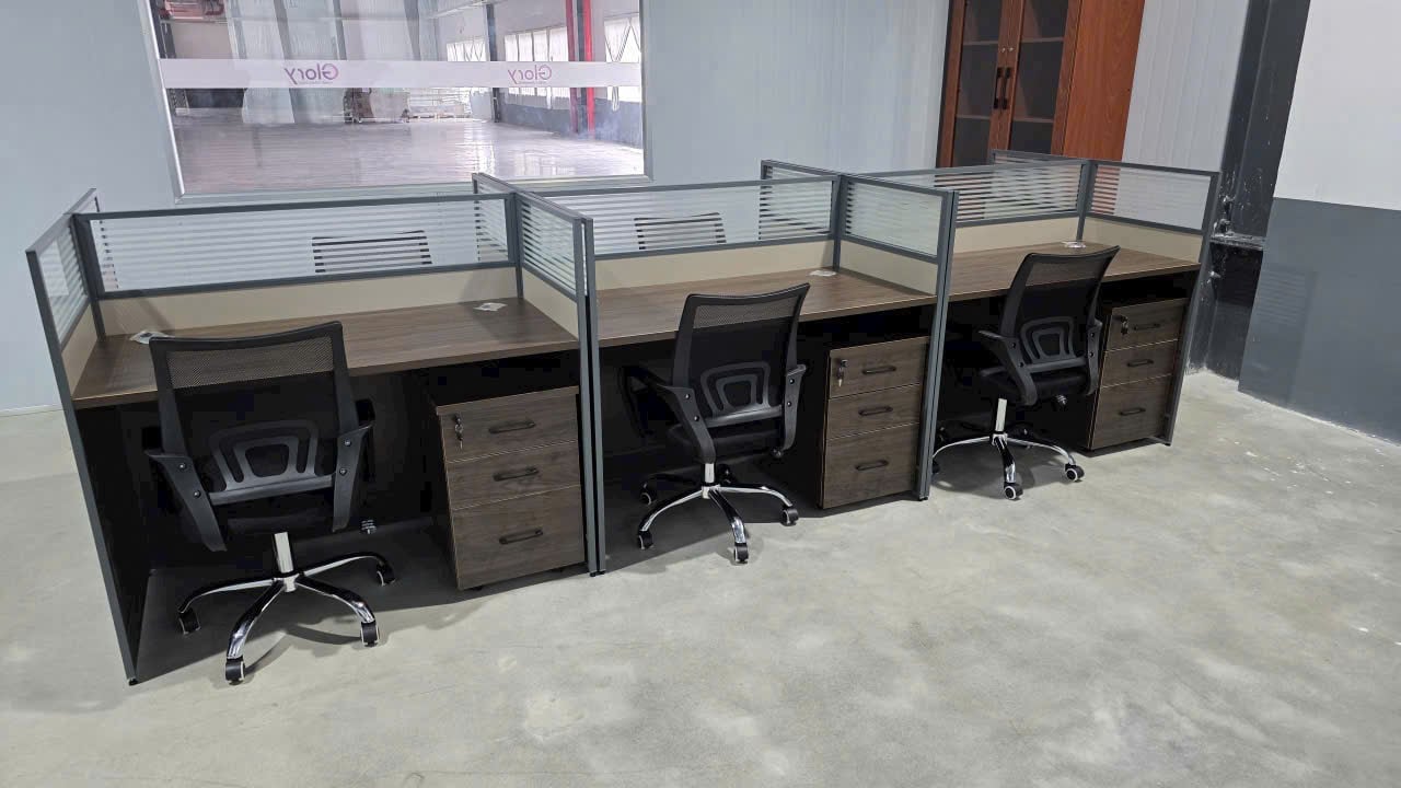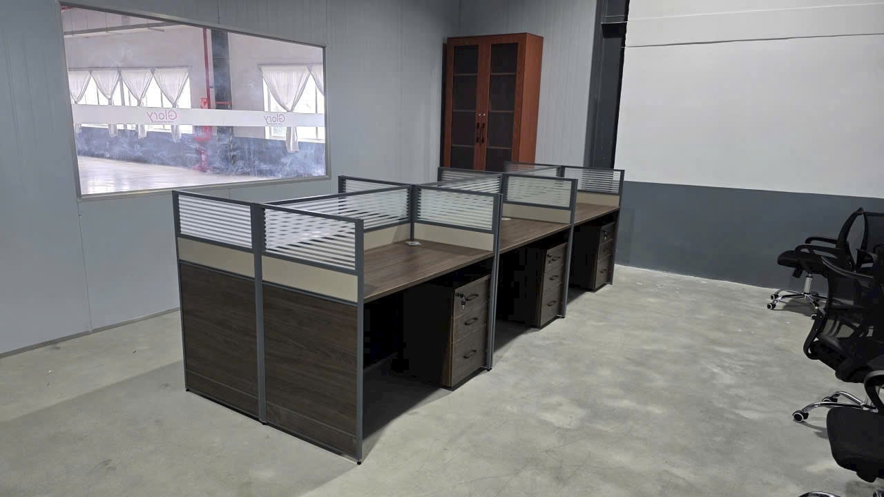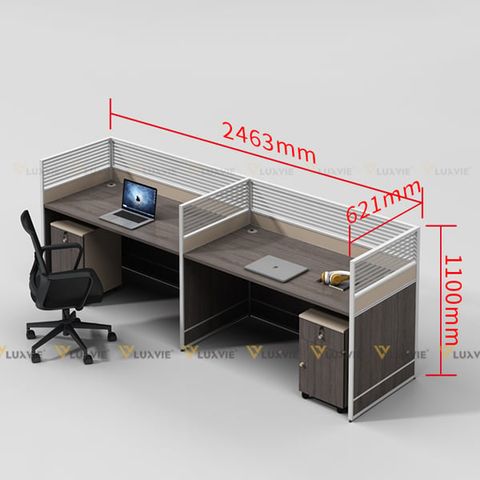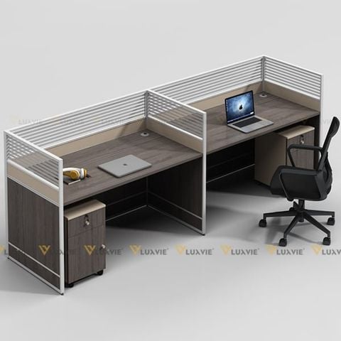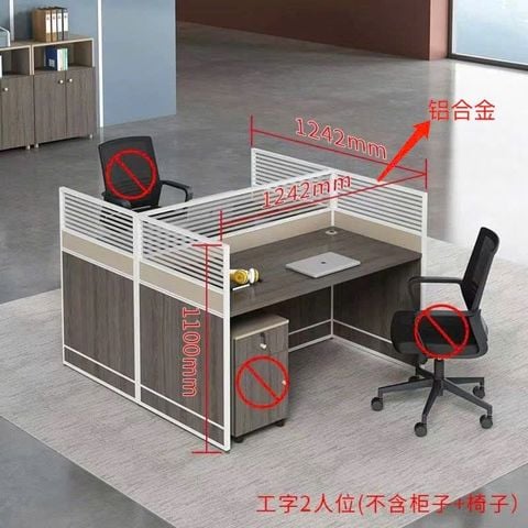 Chất liệu: Ván MFC, khung nhôm nẹp chung quanh, vách ngăn bằng kính. CÓ TỦ. (Hệ 2 bàn TKCB1)