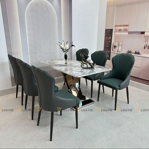 Chất liệu bàn: Mặt đá cao cấp marble. Khung inox 201 tráng gương