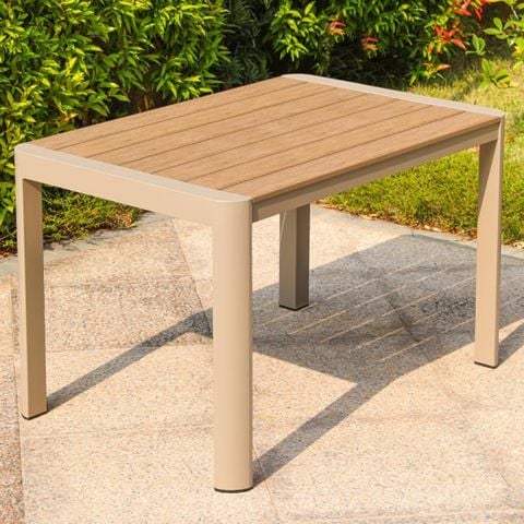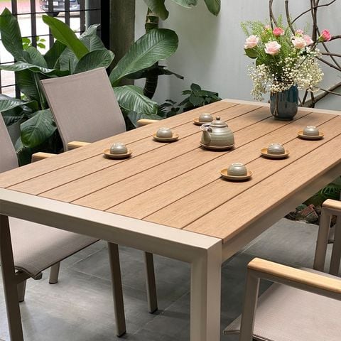 Chất liệu bàn: Khung nhôm sơn tĩnh điện + nan Polywood giả gỗ