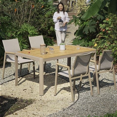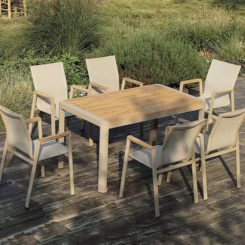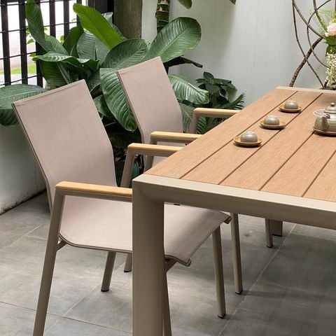 Chất liệu ghế: Khung ghế nhôm đúc. Lưng + đế ngồi bằng lưới Textilen chống nóng, Tay vịn nan gỗ Teak / Tay vịn nan composite giả gỗ