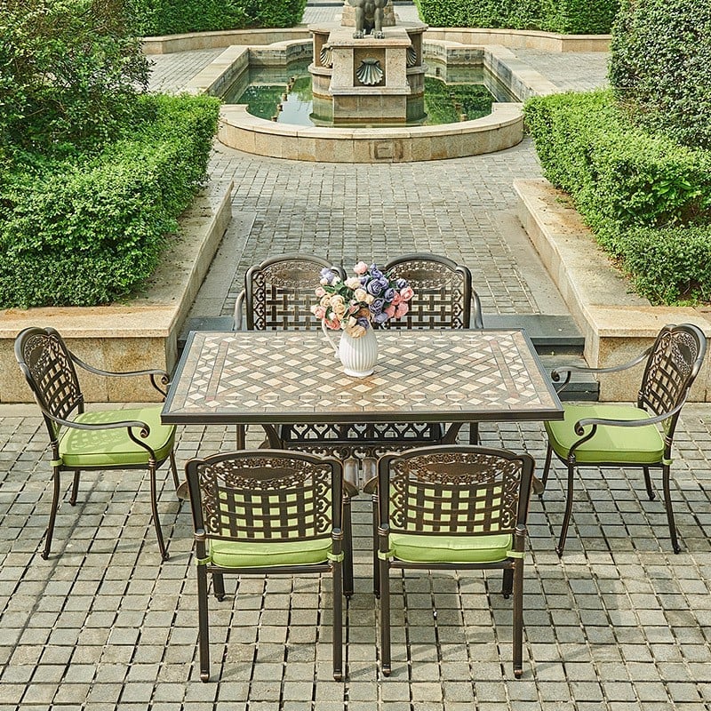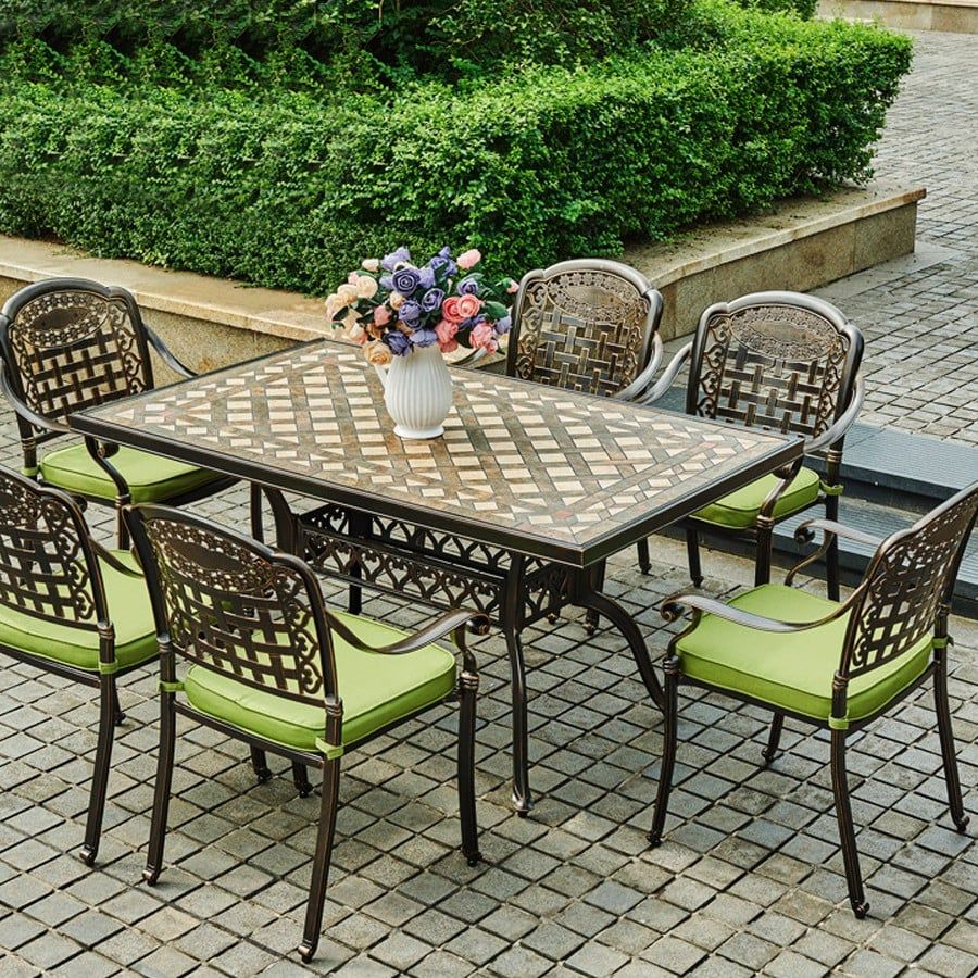 Chất liệu: Bàn được chế tạo từ nhôm đúc với lớp sơn tĩnh điện, mang lại độ bền cao và khả năng chống gỉ sét. Mặt bàn nhôm đúc kết hợp đá gốm không chỉ bảo vệ bề mặt mà còn tạo vẻ ngoài bóng bẩy, dễ dàng vệ sinh và bảo trì.