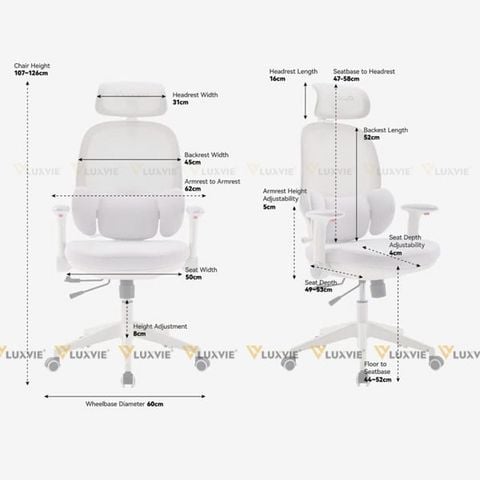 Chất liệu: Khung nhựa, lưng lưới, đệm mút, tay gập nhựa bọc đệm, chân nhựa, piston class 3
