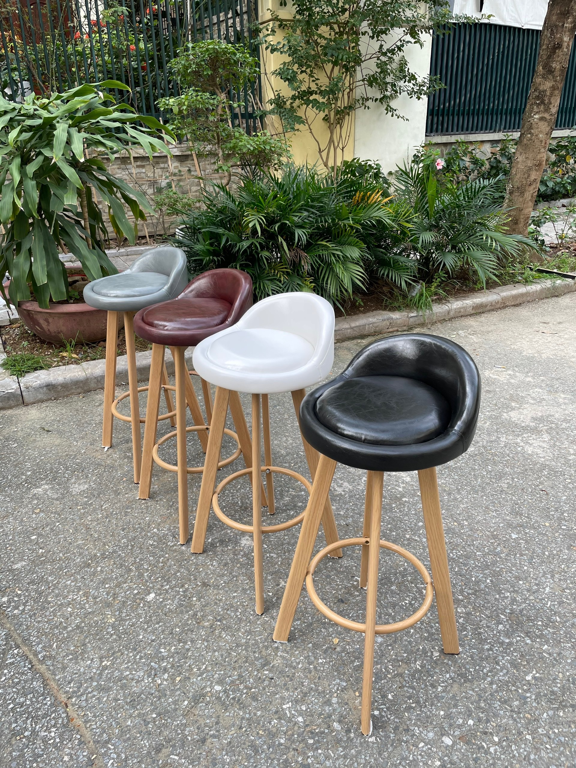 Chất liệu: Chân sắt sơn tĩnh điện giả gỗ, xoay 360°, ghế nệm simili