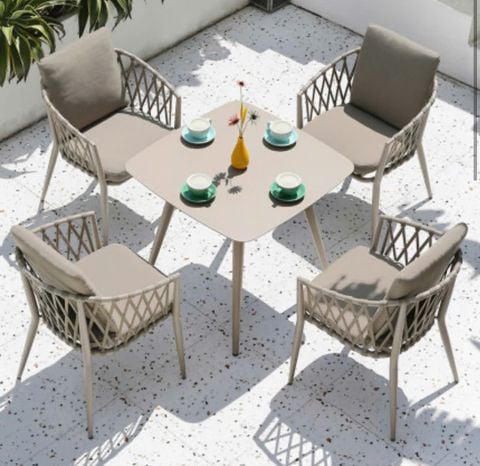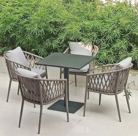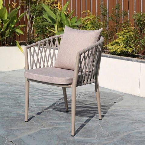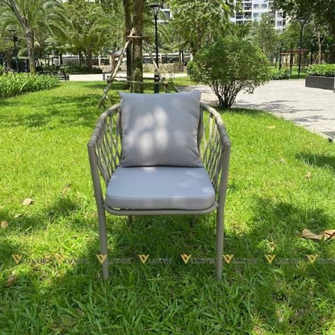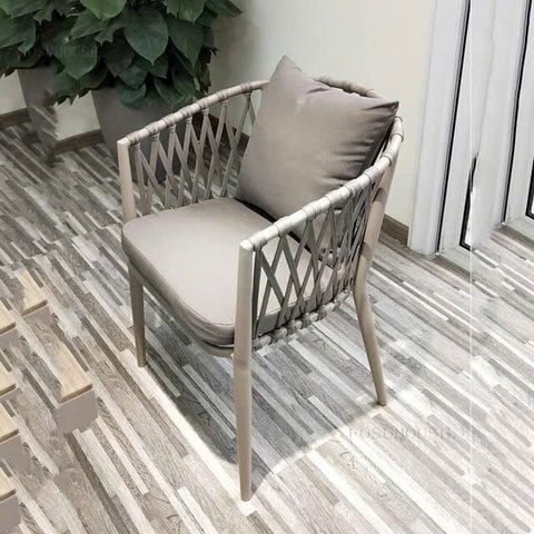 Chất liệu: Khung ghế nhôm đúc. Đan dây dù. Đệm ngồi bọc vải.