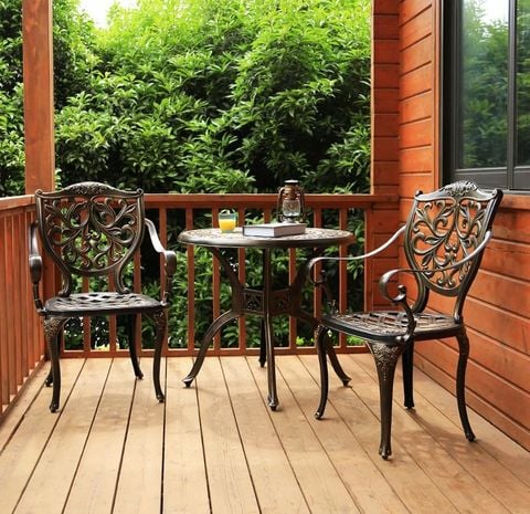 Ghế cafe ngoài trời nổi bật với màu sắc đồng sang trọng, tạo nên điểm nhấn nổi bật cho khu vực sân vườn, hiên nhà hay khu vực bên hồ bơi. Kiểu dáng đơn giản nhưng thanh lịch của ghế giúp hòa quyện dễ dàng với nhiều phong cách trang trí khác nhau, từ cổ điển đến hiện đại.