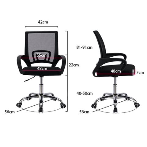 Chất liệu: Lưng nhựa lớp bọc lưới, tay nhựa cong, đệm mút bọc lưới, chân xoay mạ crom