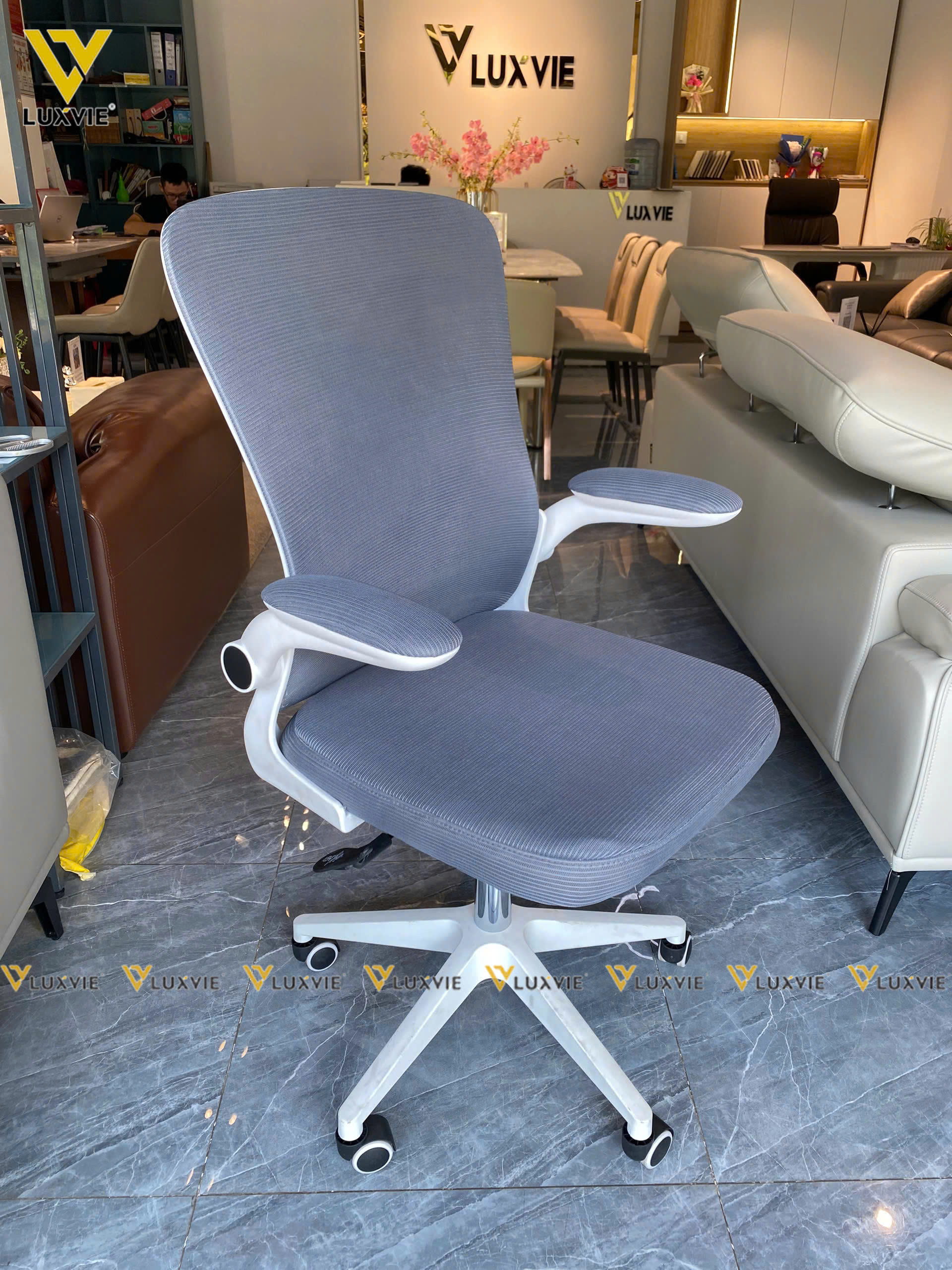 Chất liệu: Lưng nhựa lớp bọc lưới, tay gật gù, đệm mút bọc lưới, chân xoay nhựa đúc