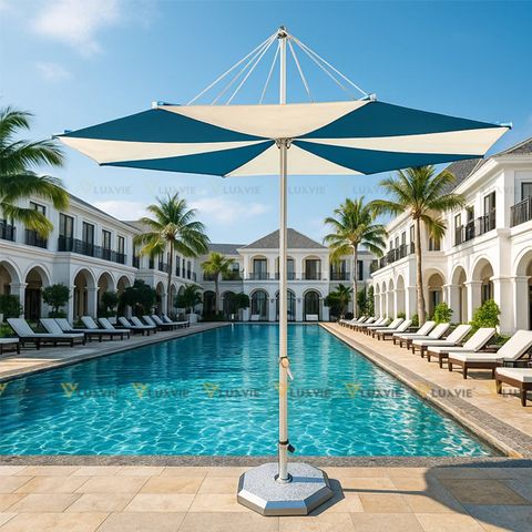 Hình dáng dù che nắng mái ngược tròn như 1 đóa hoa Tuilip nở rộ, Luxtinsol tạo ra dạng dù che nắng này mang phong cách độc đáo đáo lạ mắt này nhằm chinh phục những khách hàng cá tính. Các chi tiết dù như ổ dù, kèo dù được phơi bày phía trên thay vì phía dưới mái che, giúp cho không gian xung quanh càng trở nên sang trọng và đằng cấp hơn.