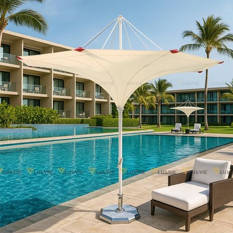 Hình dáng dù che nắng mái ngược tròn như 1 đóa hoa Tuilip nở rộ, Luxtinsol tạo ra dạng dù che nắng này mang phong cách độc đáo đáo lạ mắt này nhằm chinh phục những khách hàng cá tính. Các chi tiết dù như ổ dù, kèo dù được phơi bày phía trên thay vì phía dưới mái che, giúp cho không gian xung quanh càng trở nên sang trọng và đằng cấp hơn.