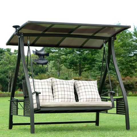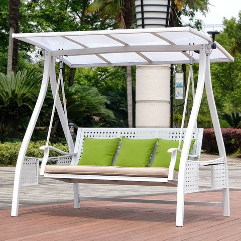 Khung xích đu được làm từ nhôm đúc sơn tĩnh điện, giúp sản phẩm chống gỉ sét và giữ được vẻ đẹp lâu dài ngay cả khi tiếp xúc với các điều kiện thời tiết khắc nghiệt. Nệm ngồi và mái che được bọc bằng vải Polyester trượt nước, đảm bảo xích đu luôn sạch sẽ và khô ráo. Chất liệu này không chỉ giúp bảo vệ xích đu khỏi ẩm ướt mà còn mang đến cảm giác êm ái và dễ chịu khi sử dụng.